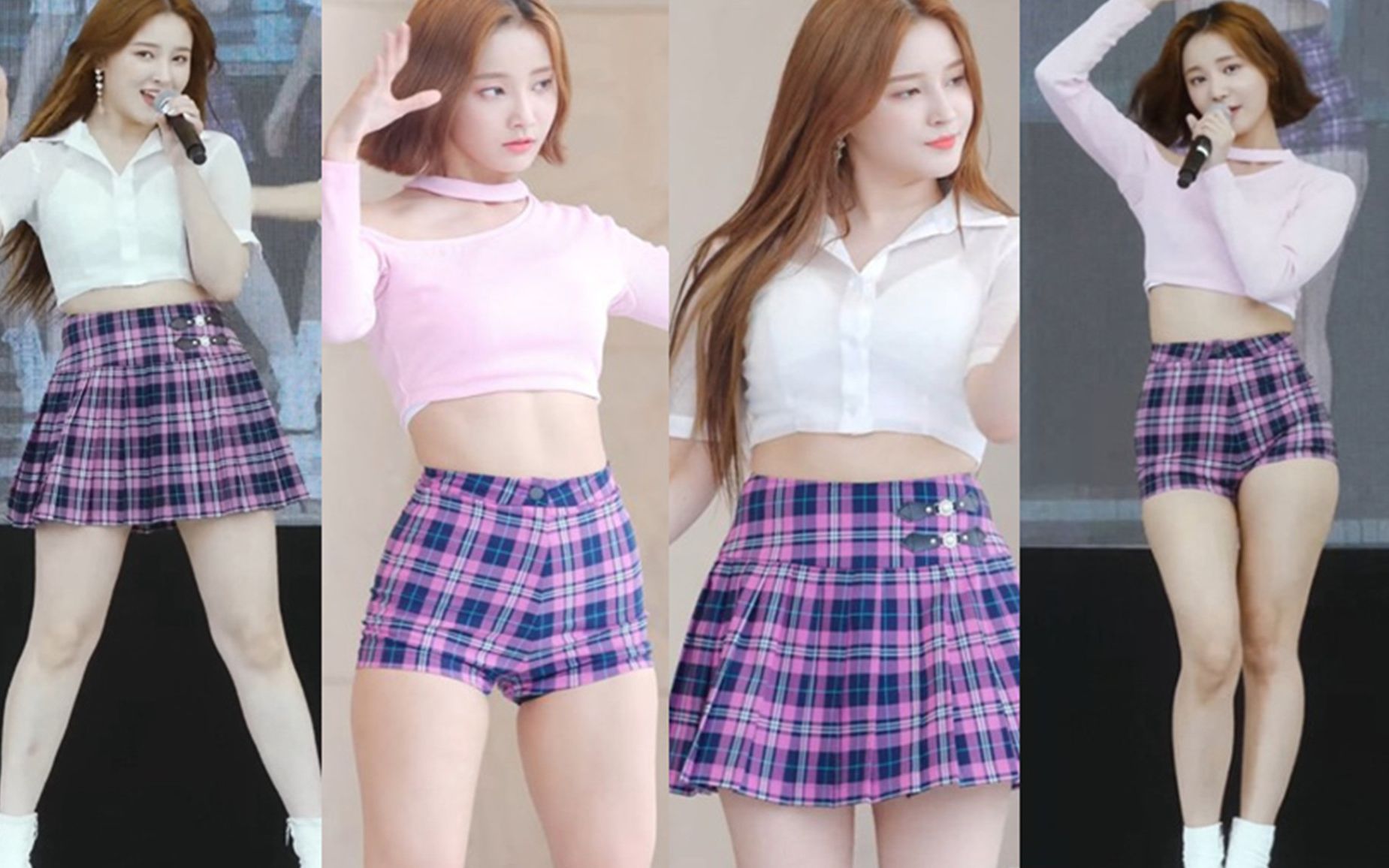 Momoland 妍雨 身材, 妍雨身穿红色露腹装搭粉红色格子短裤尽显好