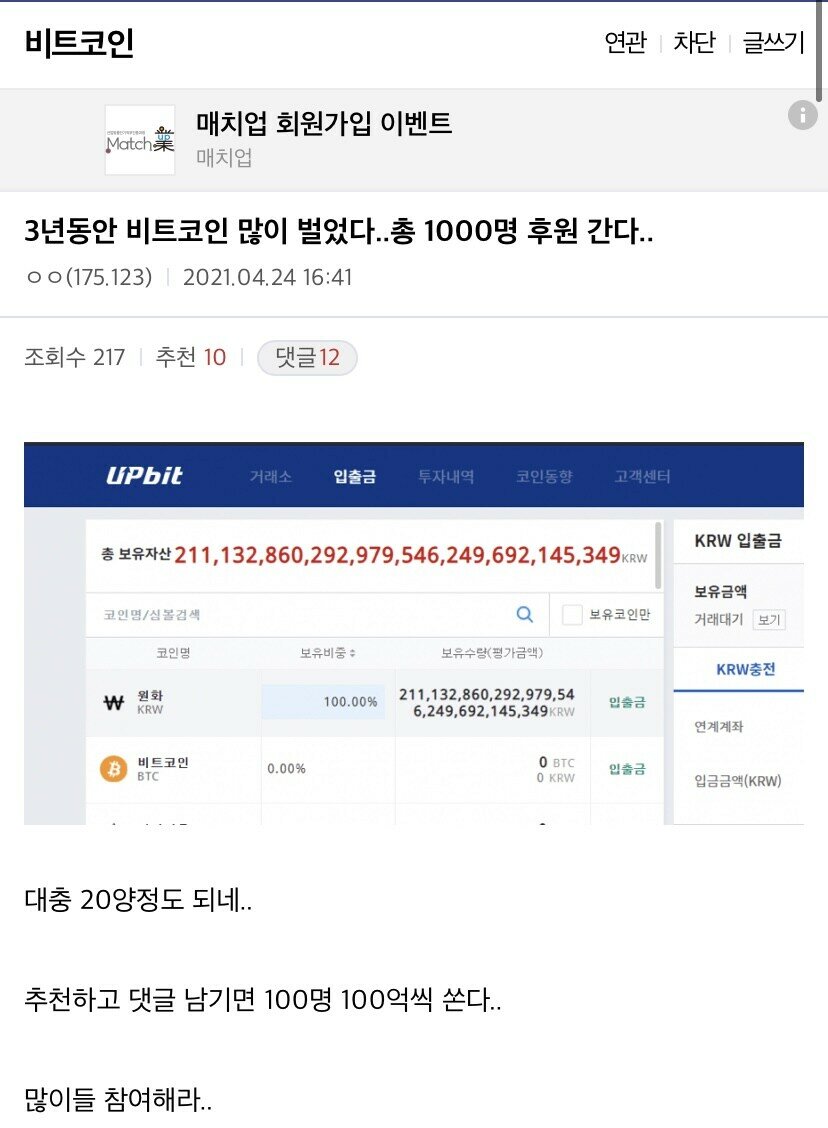 비트코인으로 340억 벌었다 1억씩 10명 구제한다 글에 달린 댓글들 중앙일보